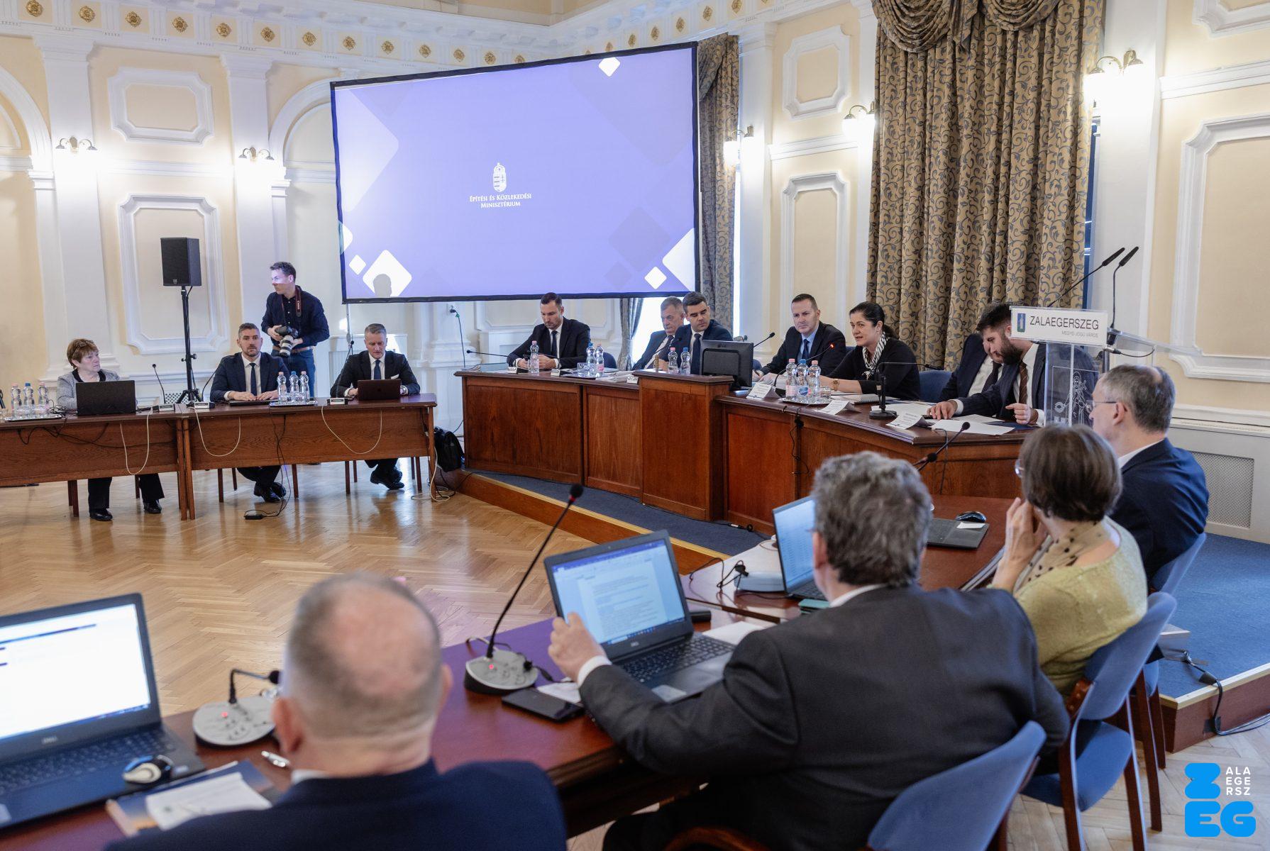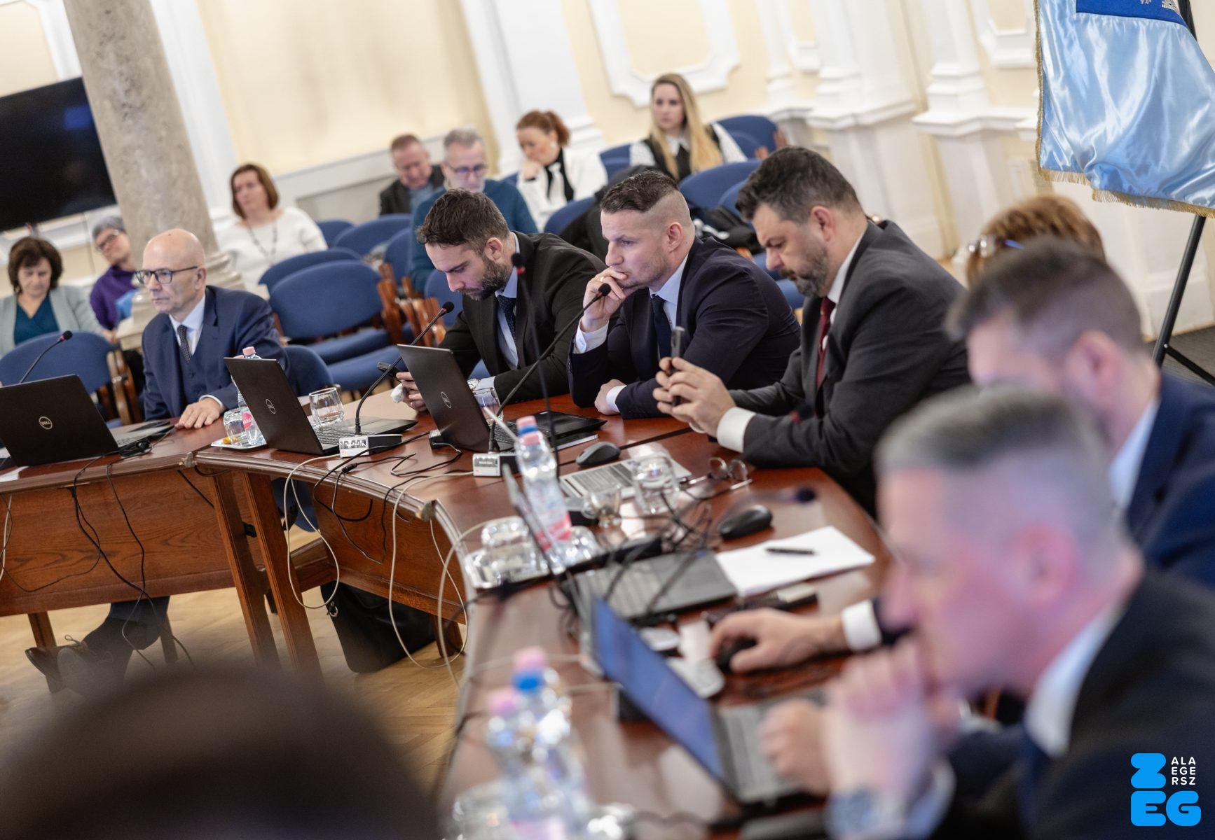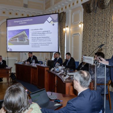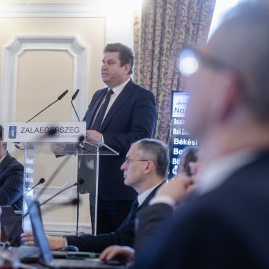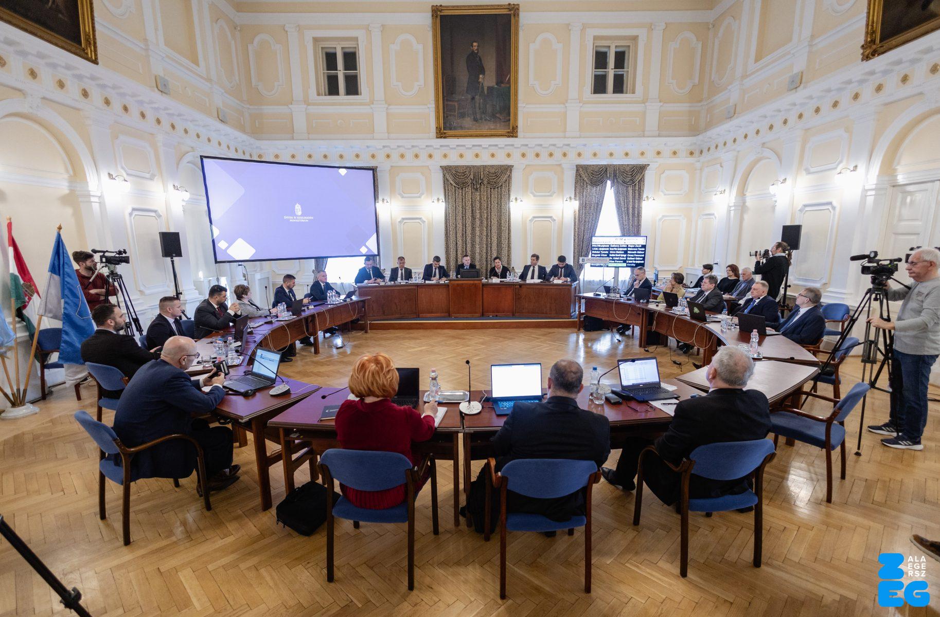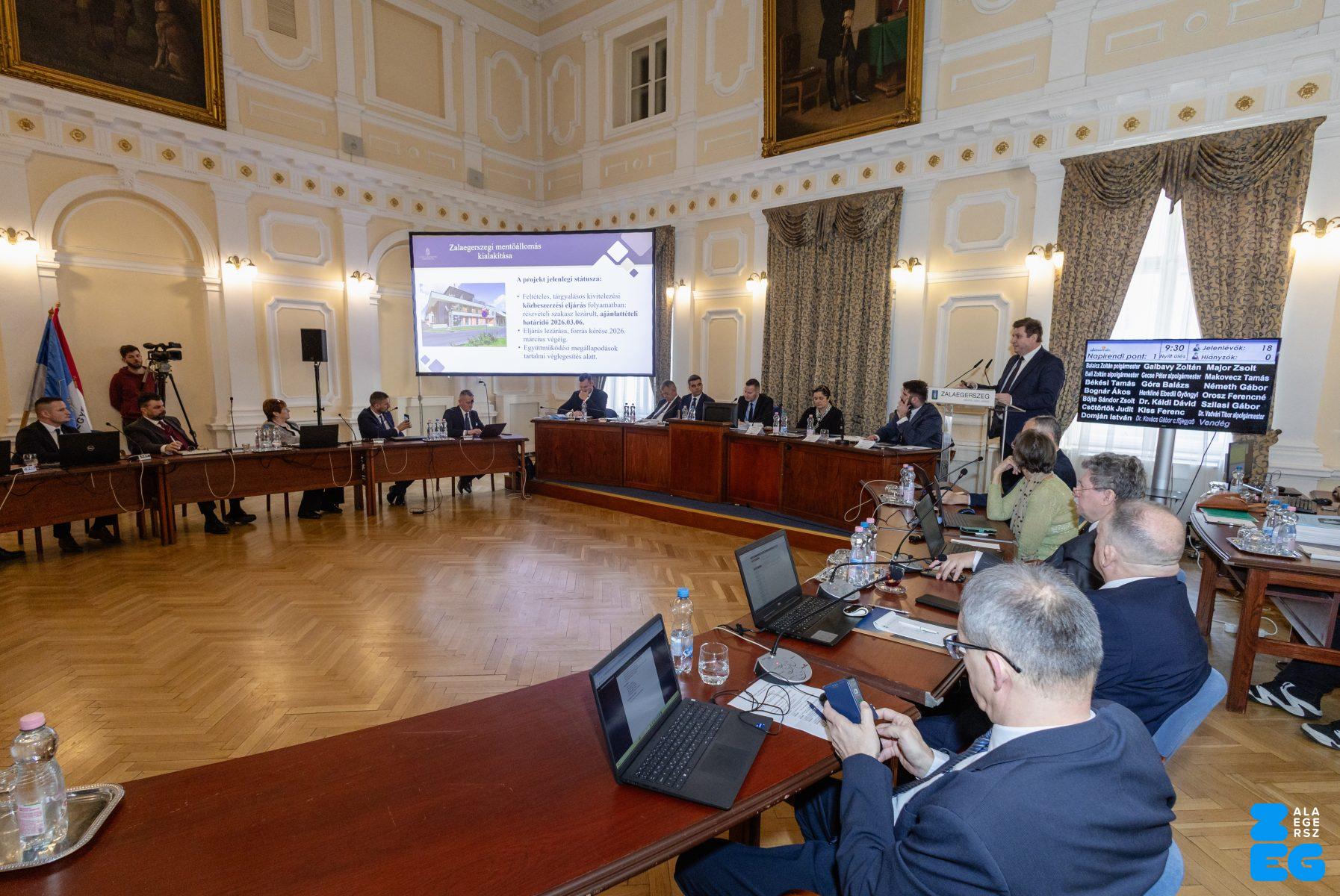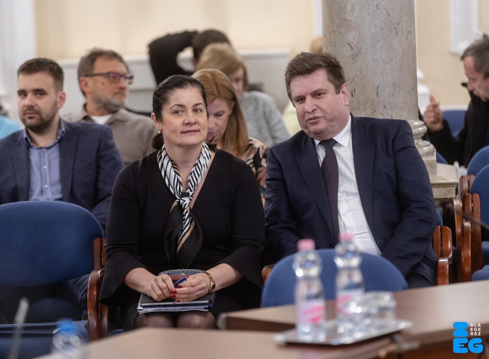 Zalaegerszeg Megyei Jogú Város Önkormányzatának évi rendes közgyűlésének első pontjában az Építési és Közlekedési Minisztérium képviseletében megjelent Juhász Tünde államtitkár és Nyul Zoltán helyettes államtitkár tájékoztatatta a Zalaegerszegi mentőállomás terveiről a város képviselő-testületét. Ezt követően elfogadták a város költségvetését (Díszterem, 2026.02.12.) – Fotó: Seres Péter