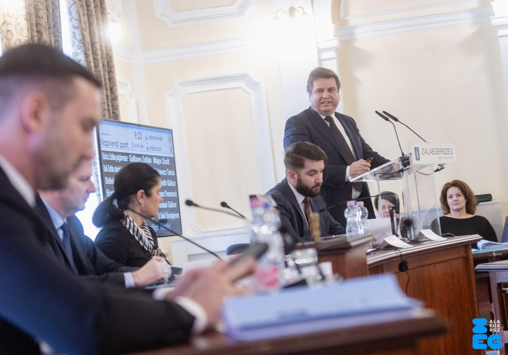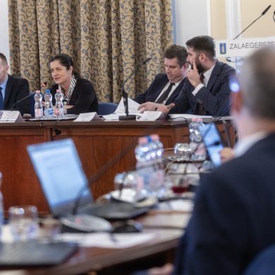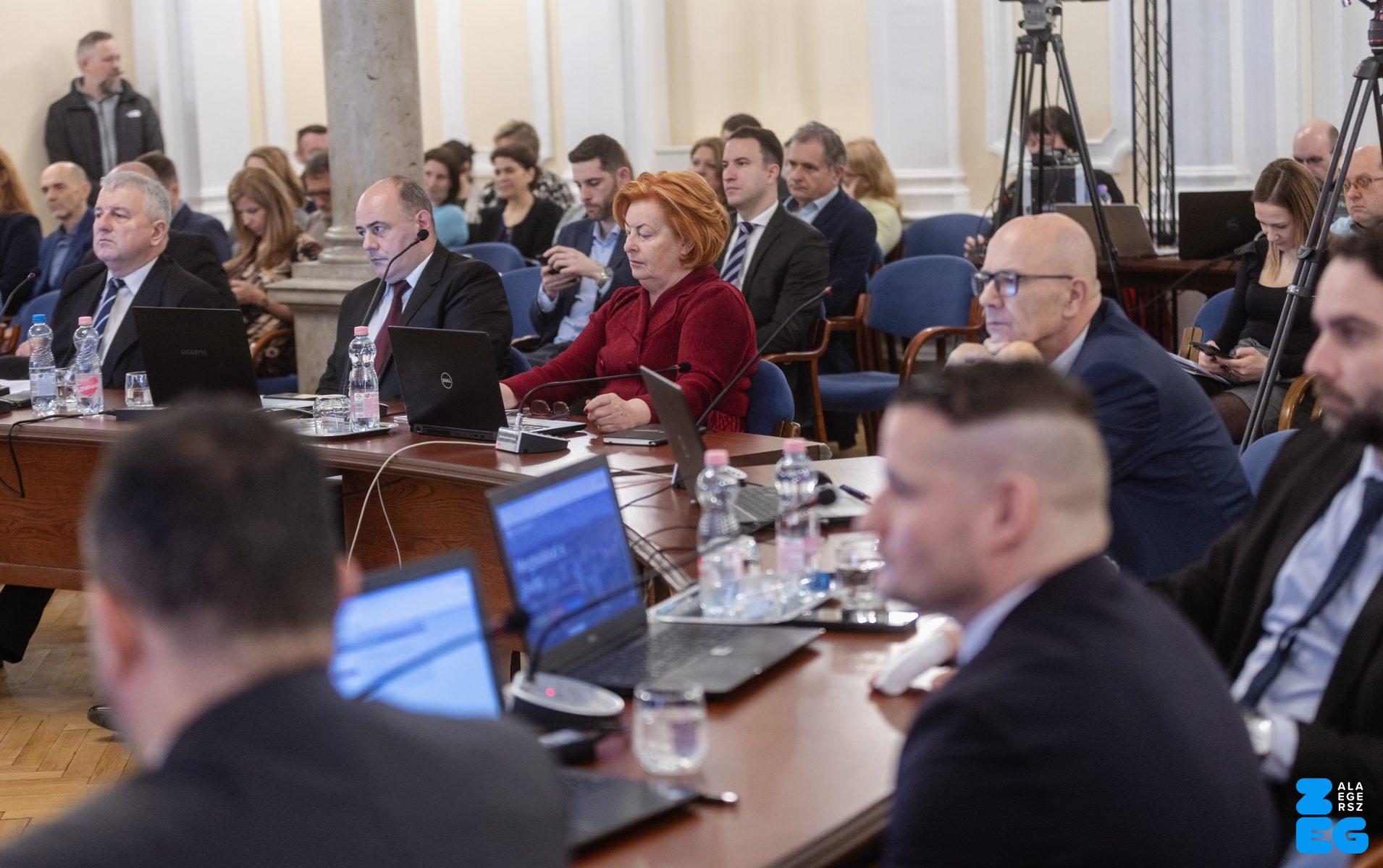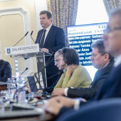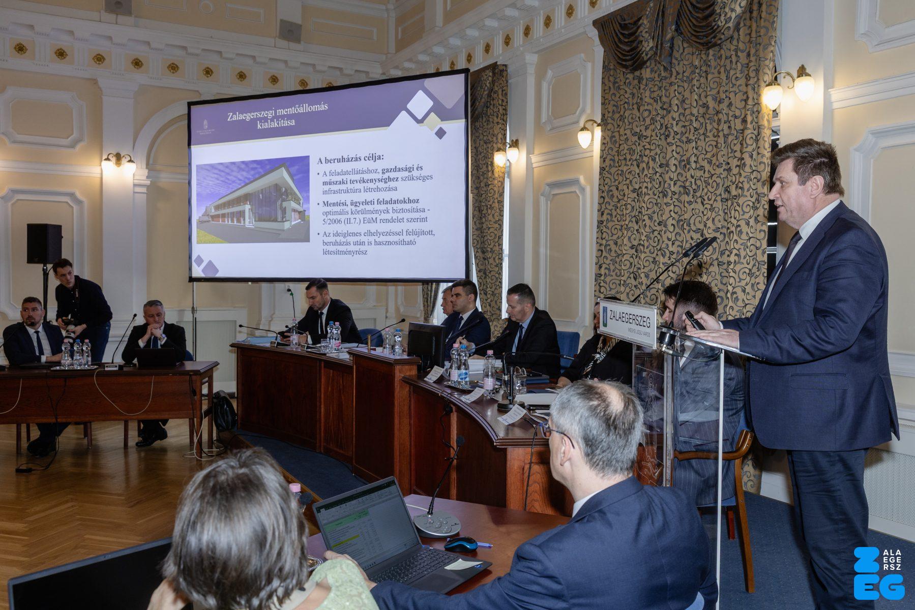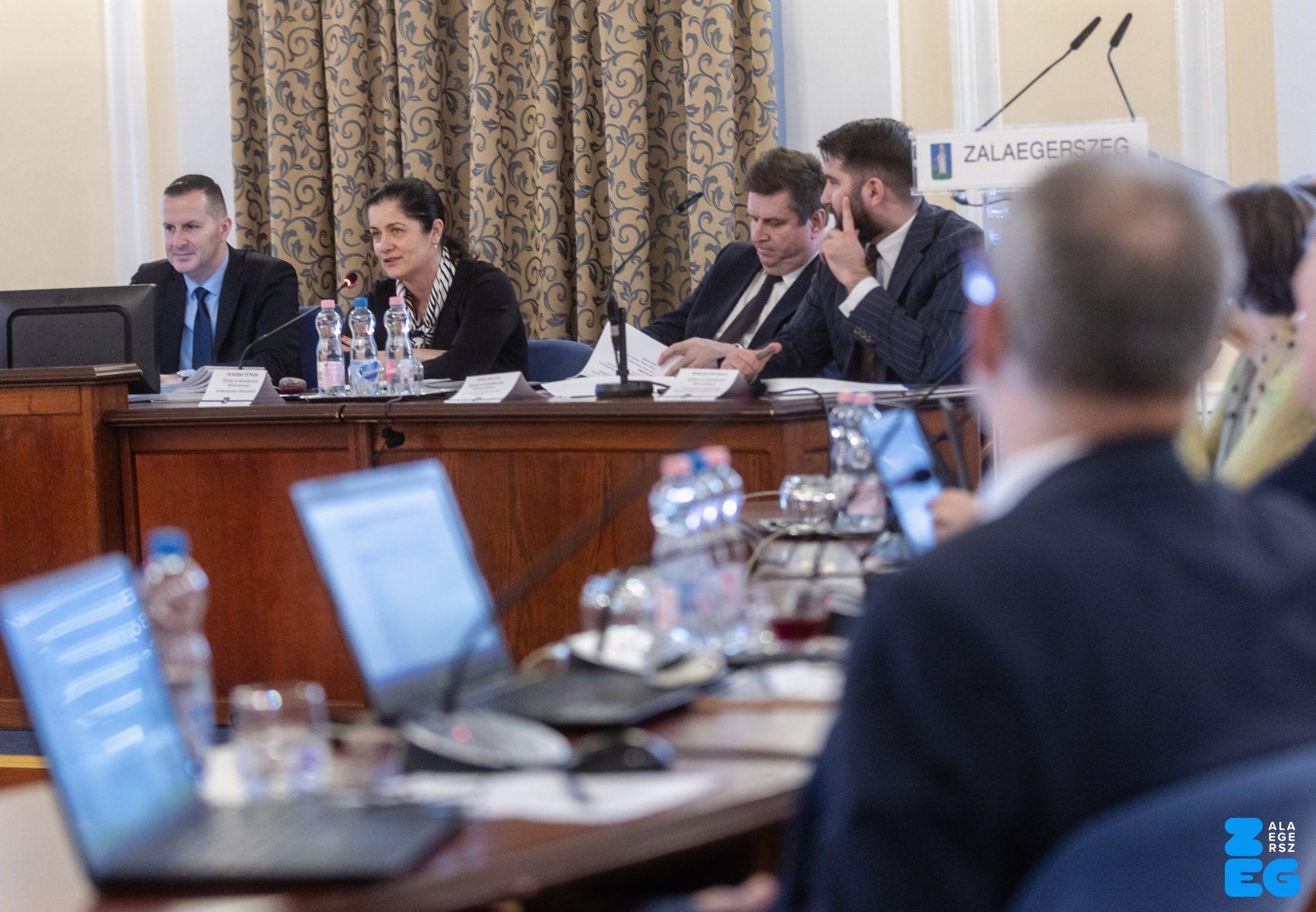 Zalaegerszeg Megyei Jogú Város Önkormányzatának évi rendes közgyűlésének első pontjában az Építési és Közlekedési Minisztérium képviseletében megjelent Juhász Tünde államtitkár és Nyul Zoltán helyettes államtitkár tájékoztatatta a Zalaegerszegi mentőállomás terveiről a város képviselő-testületét. Ezt követően elfogadták a város költségvetését (Díszterem, 2026.02.12.) – Fotó: Seres Péter
