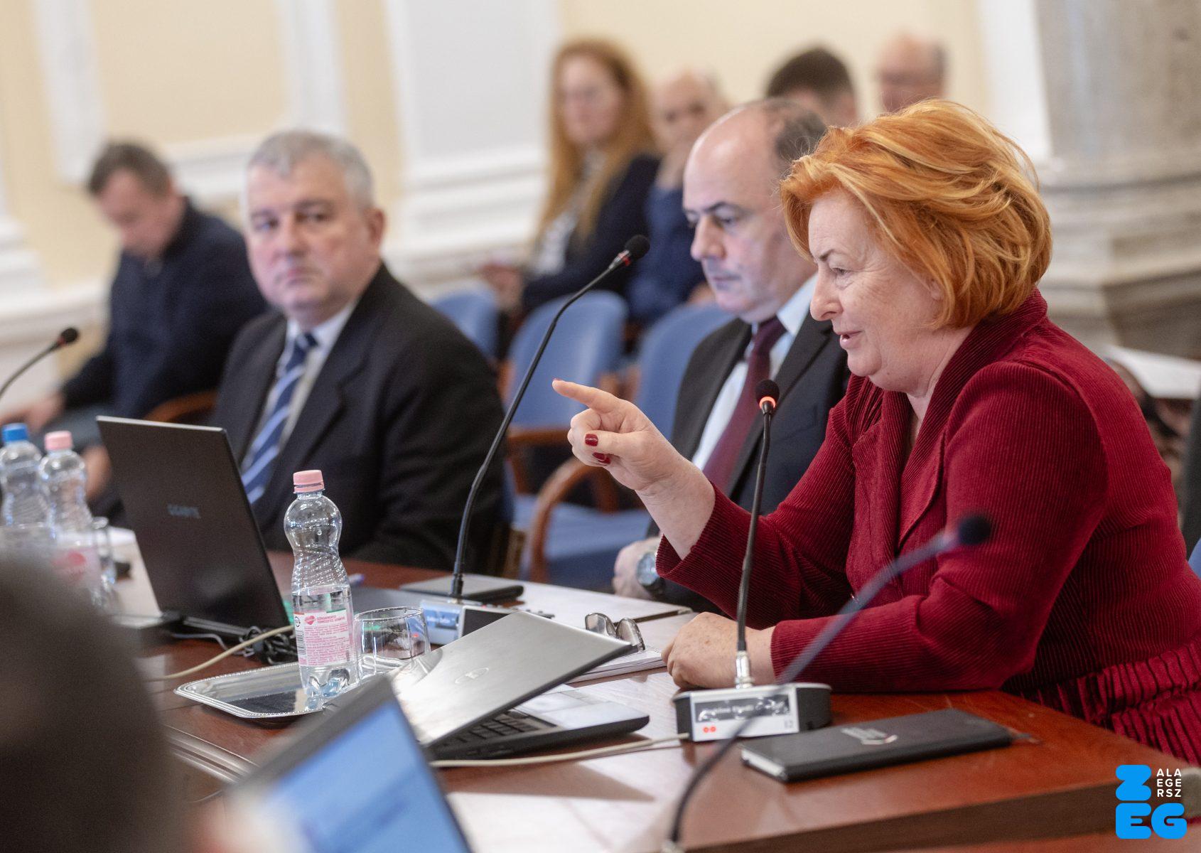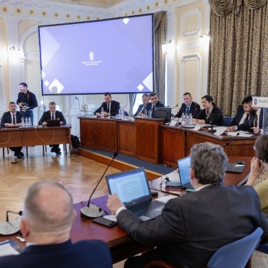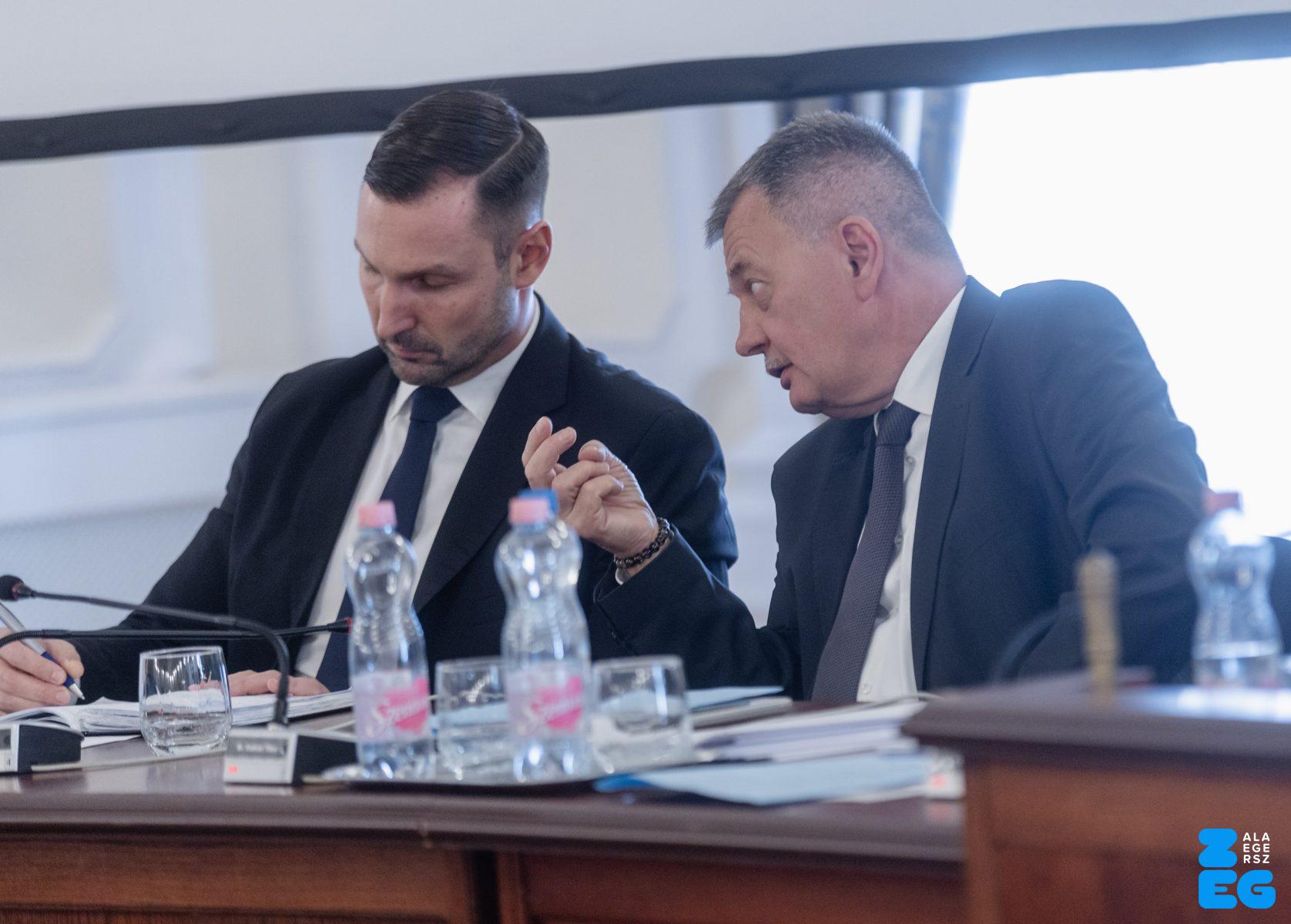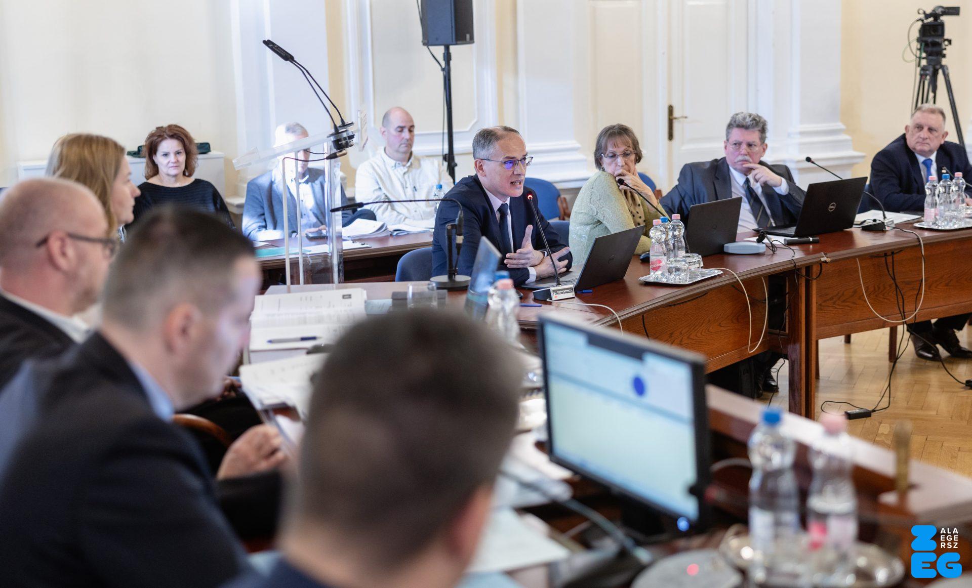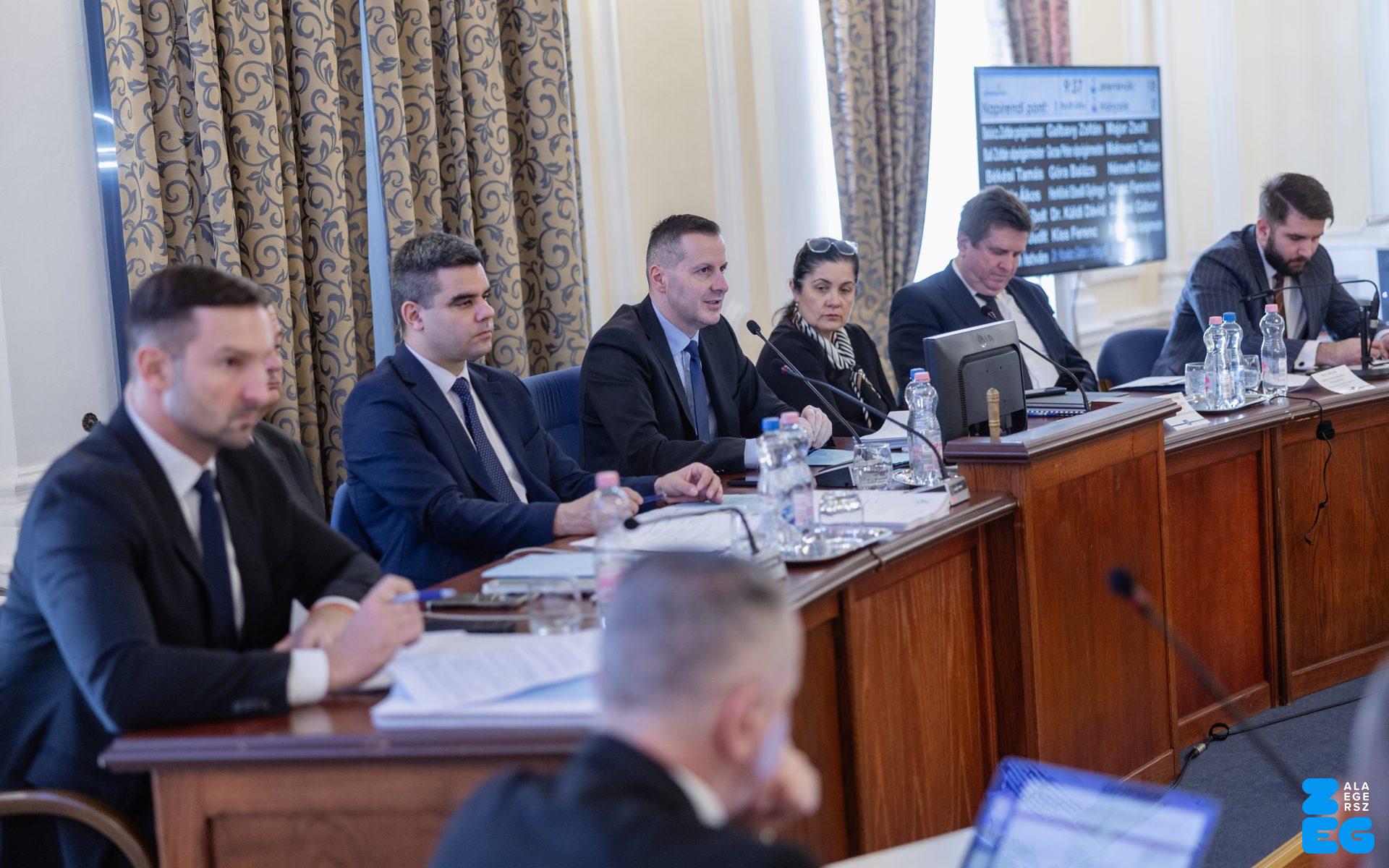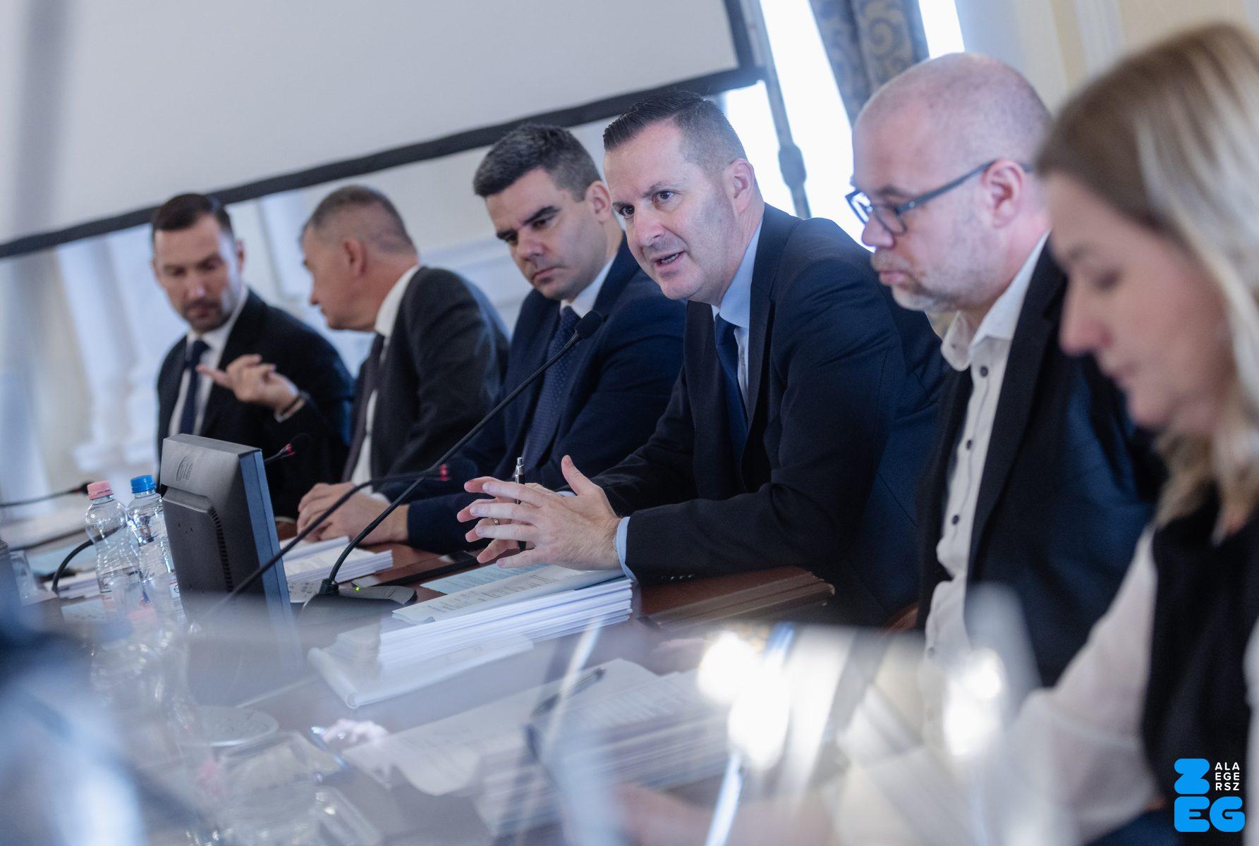 Zalaegerszeg Megyei Jogú Város Önkormányzatának évi rendes közgyűlésének első pontjában az Építési és Közlekedési Minisztérium képviseletében megjelent Juhász Tünde államtitkár és Nyul Zoltán helyettes államtitkár tájékoztatatta a Zalaegerszegi mentőállomás terveiről a város képviselő-testületét. Ezt követően elfogadták a város költségvetését (Díszterem, 2026.02.12.) – Fotó: Seres Péter