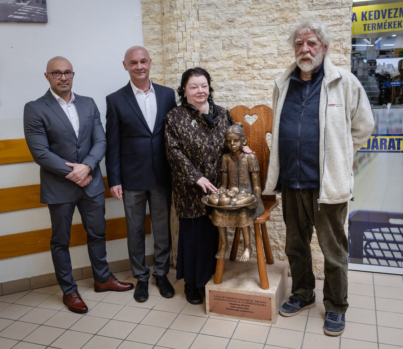 Az eseményen a város képviselői az áruház tulajdonosát több elismerésben részesítették. Ezt követően leleplezték Szabolcs Péter szobrát, amely ezentúl az ide betérőket fogadja.